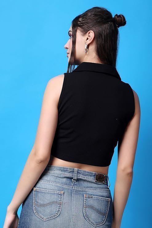 - Fabric: This black solid waistcoat crop top for women is tailored with premium polyester fabric. The fabric ensures all-day comfort, especially in warmer months.