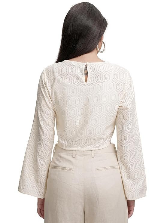 • ????? Product Description: This bell sleeve crop crochet top features a closed round neck for a sleek, boho-inspired look. The intricate crochet detailing adds texture, while the bell sleeves provide a dramatic, airy feel, making it perfect for warmer weather