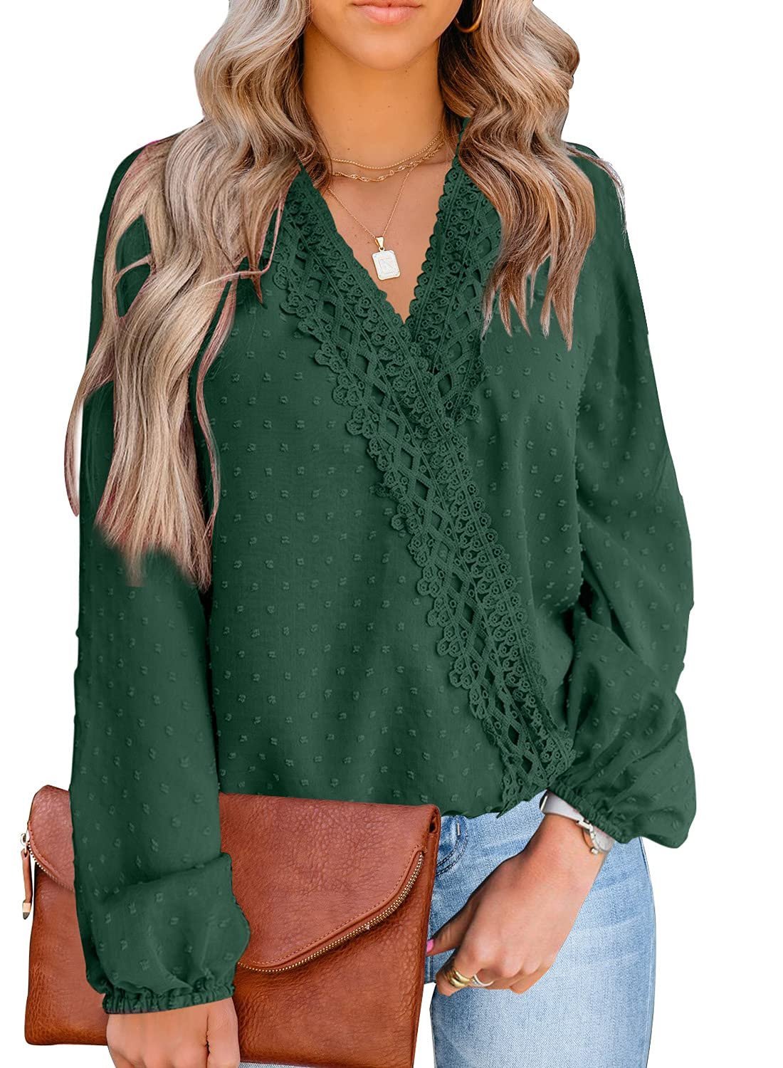 Womens Chiffon Blouse Casual Long Sleeve V Neck Pom Poms Shirts Tops, Green, Large