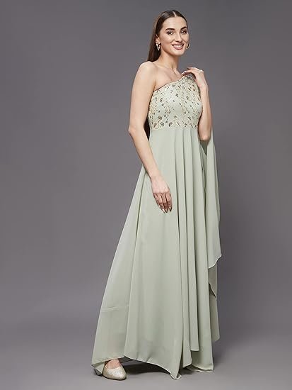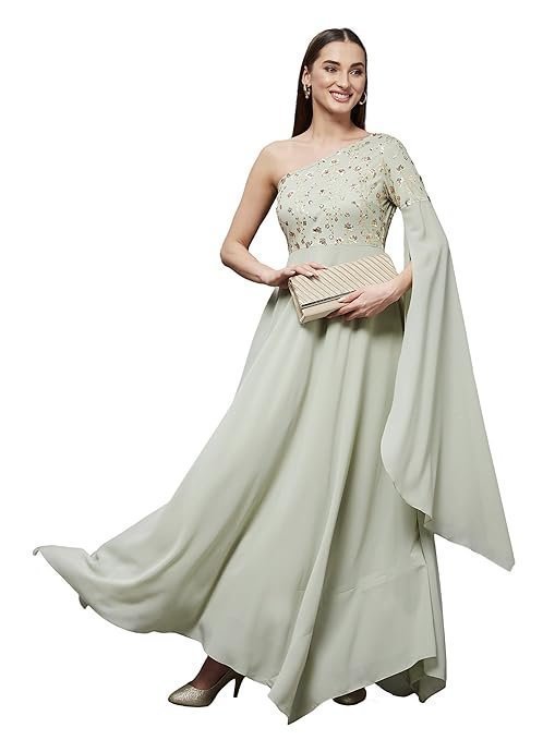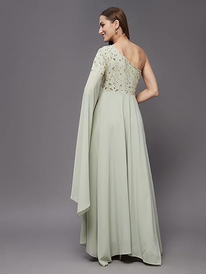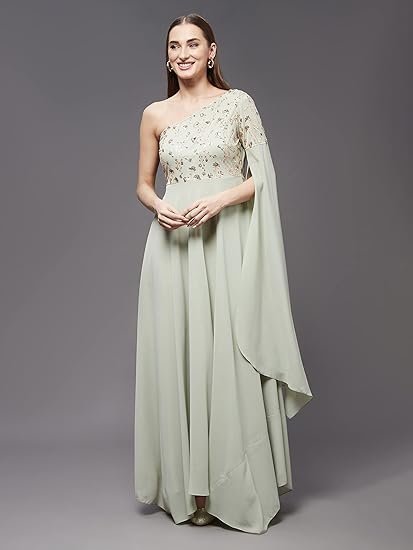 - Pattern: Solid | Fit: Relaxed Fit | Sleeve: Long Sleeves | Length: Maxi | Neck: One-Shoulder | Style: Embellished/Asymmetric