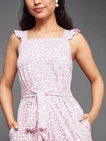 • Style: Waist Tie-Up | Pattern: Animal | Fit: Relaxed Fit | Length: Regular | Closure: Zip | Neck: Square Neck | Sleeves: Sleeveless | Pockets: Yes, 2 Side Pockets