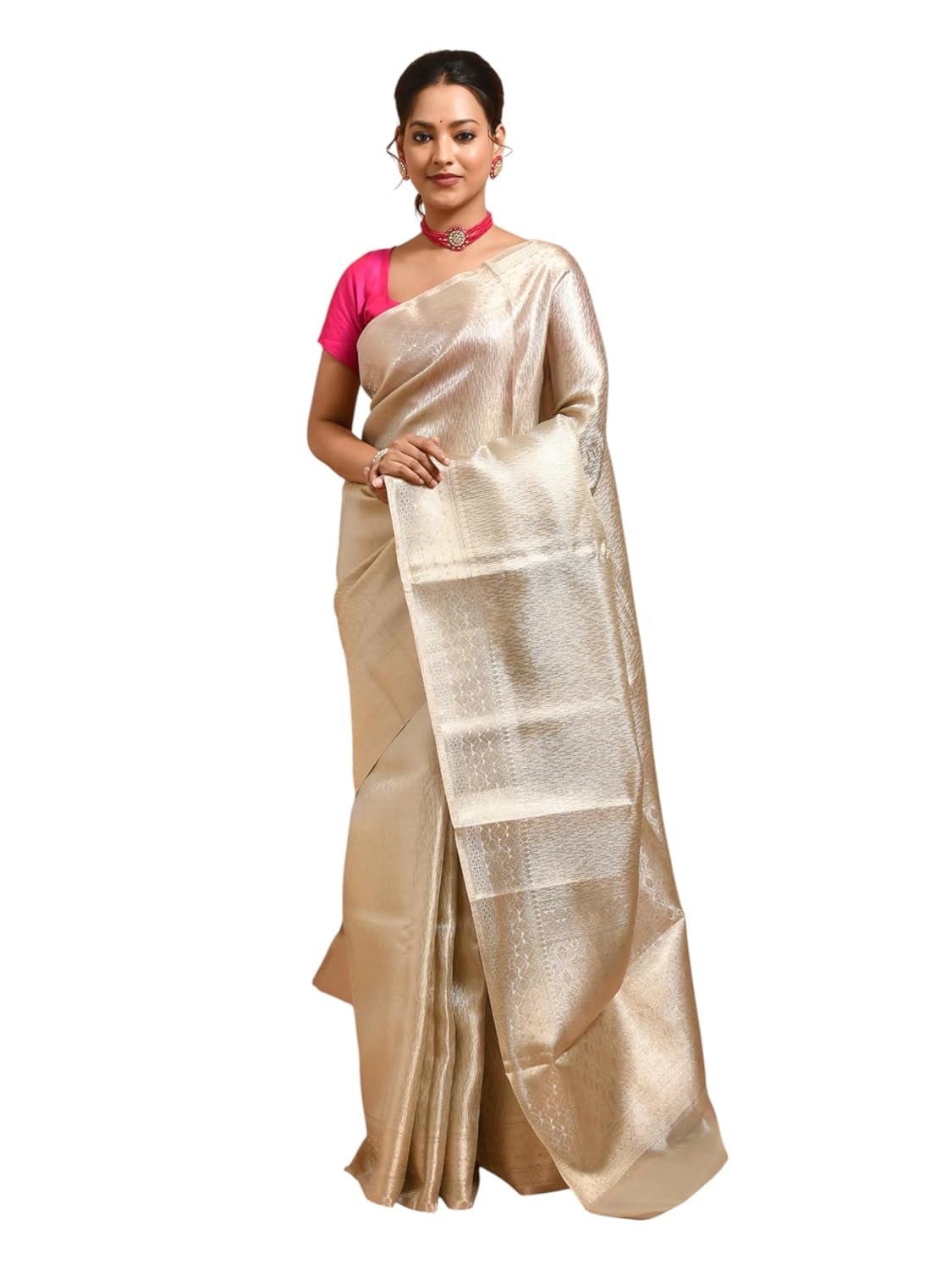 - Specialty – Features Banaras-style refined, vertically lined woven geometric detailing throughout the body and a sleek diamond design zari border. The pallu is adorned with a jacquard-inspired motifs resembling delicate overlapping scale patterns.